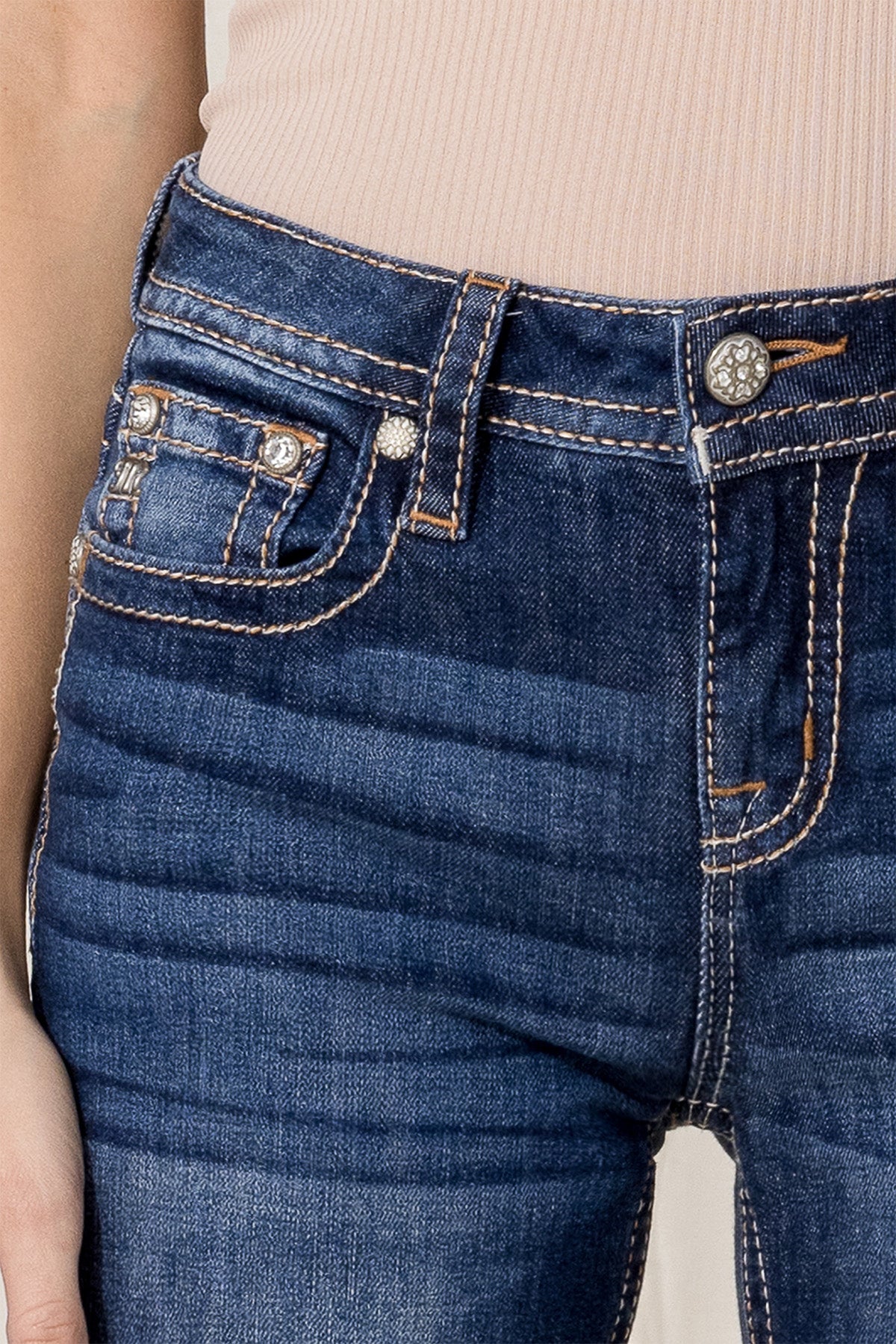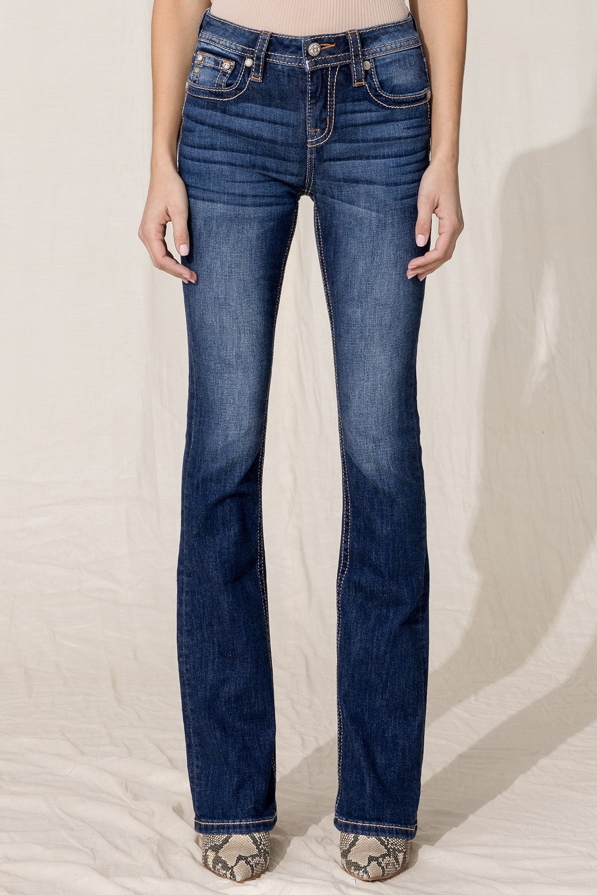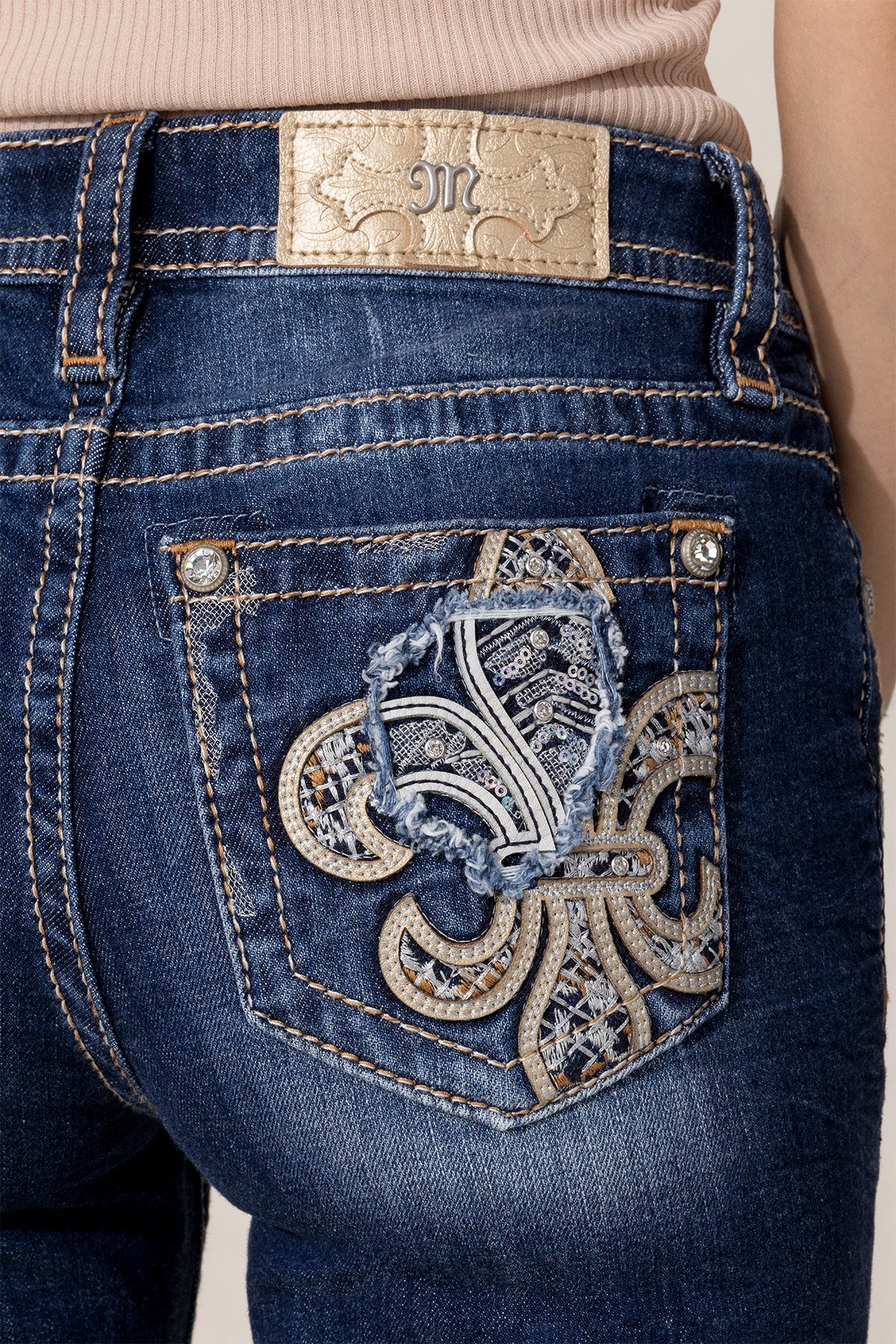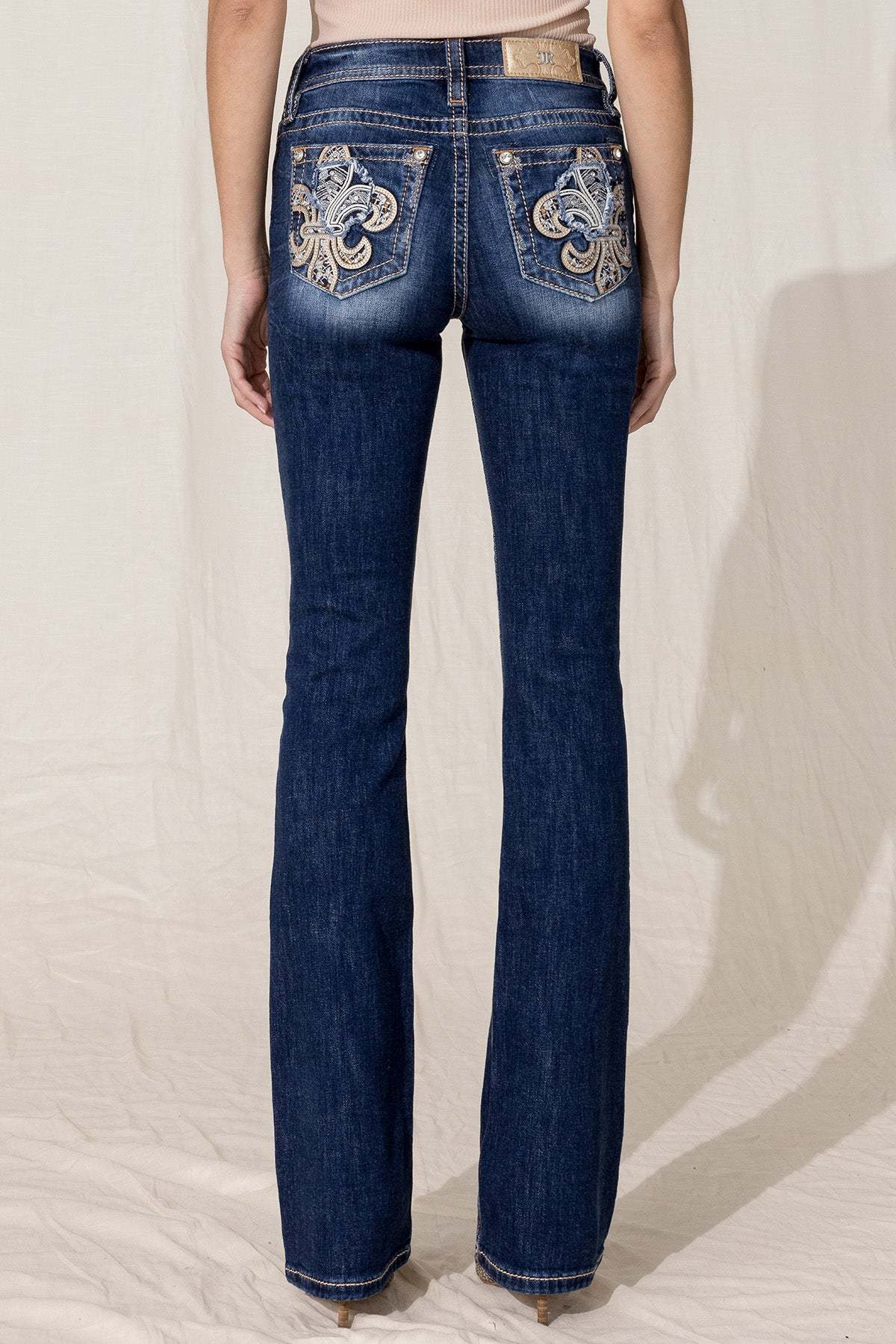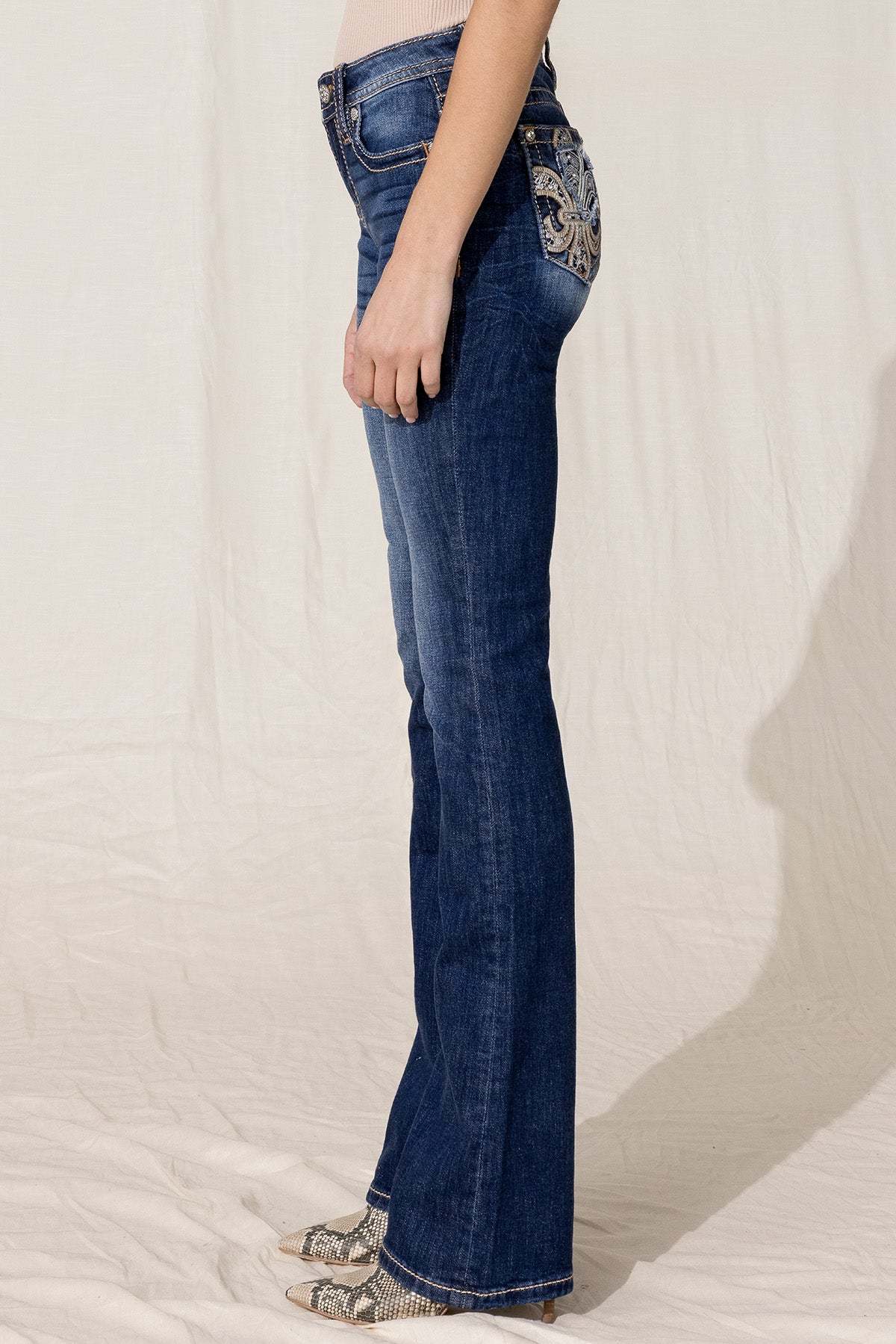 Mid rise dark wash bootcut detailed with hand sanding, whiskering, embroidered Fleur De Lis with studded trim and blowout pockets and a 5 pocket with rhinestone rivets.